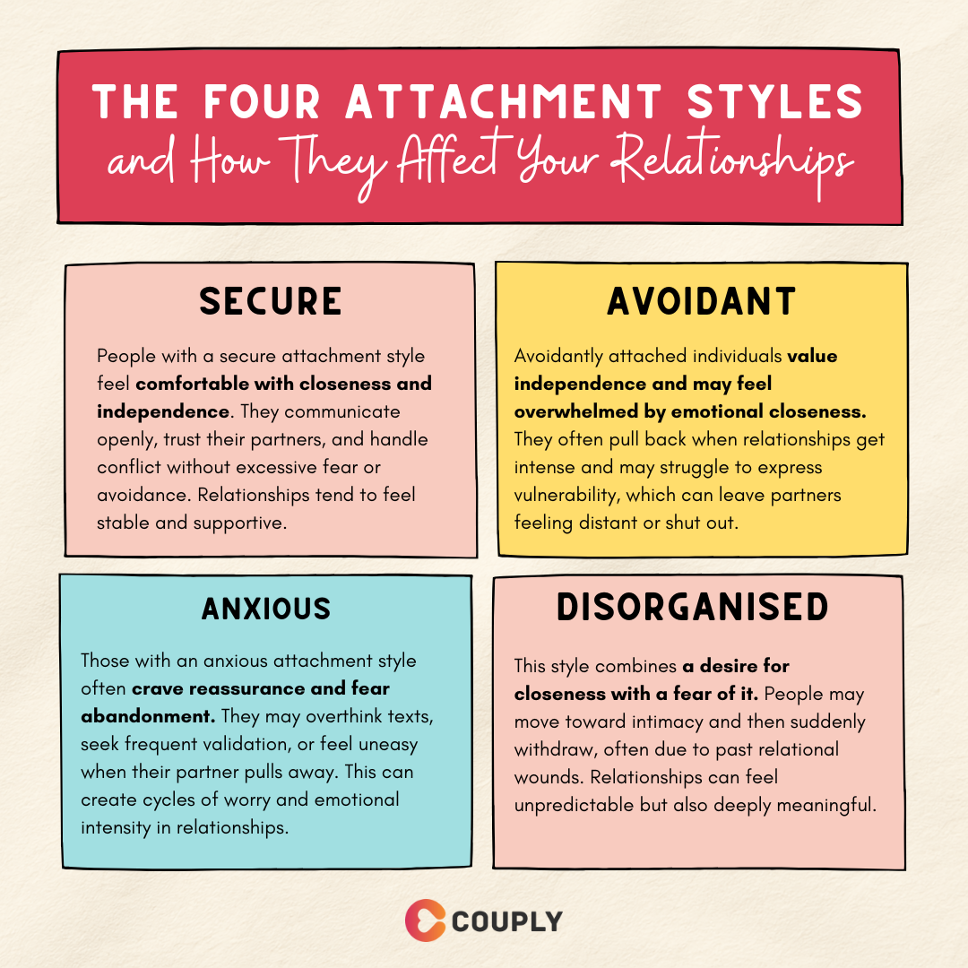 Want to find out yours and your partner’s attachment styles? Want an even more in-depth analysis of what this all means? Download Couply on Android or Apple and take the attachment styles test. Couply app has also a lot of free couples quiz, relationship questions, and dating questions games for you and your partner to enjoy.