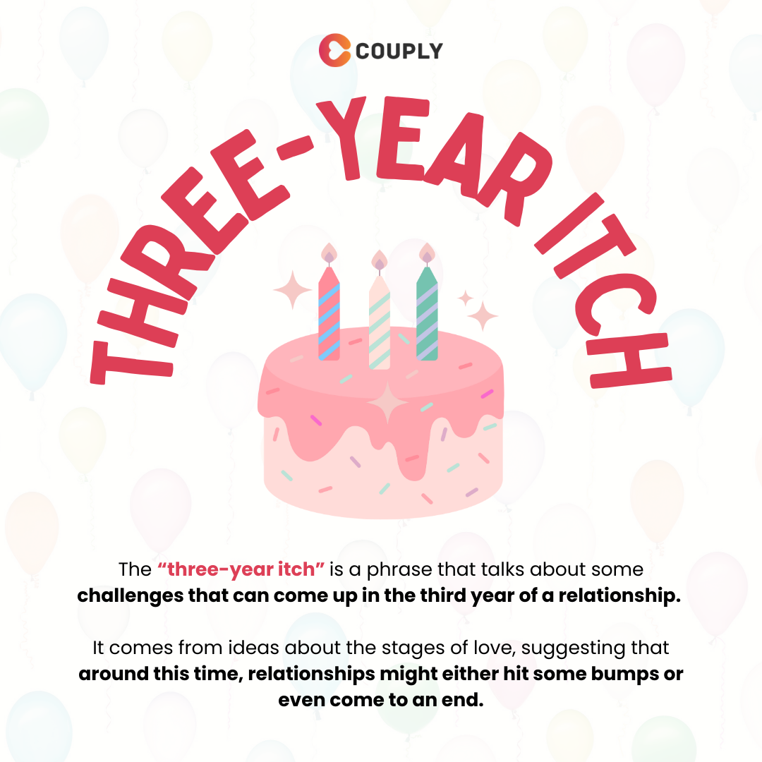 The 3-year itch is that nagging feeling some couples get around their third anniversary where they start questioning their relationship. You may find yourself constantly daydreaming about what life would be like with someone new, or suddenly hyper-aware of your partner's little annoying habits that you never noticed before.
